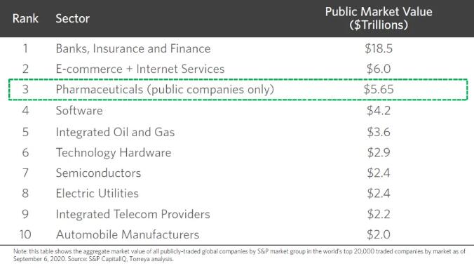 據(jù)Torreya估計,當今全球制藥業(yè)的總價值為6.65萬億美元,同比增長為24.3%。其中,5.65萬億美元與上市公司有關。如果把制藥行業(yè)看成一個國家,它將在世界排名第15位,超過墨西哥,印度尼西亞,瑞典或波蘭的GDP。制藥行業(yè)已經(jīng)成為除金融和電商、互聯(lián)網(wǎng)領域之外的第三大最有價值的行業(yè),而在中國,生物醫(yī)藥產(chǎn)業(yè)市值已經(jīng)成為除銀行之外的第二大行業(yè)。
