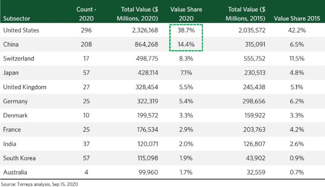 過去5年,制藥產(chǎn)業(yè)發(fā)展從以美國、瑞士、德國、法國為主的西方發(fā)達國家,逐步轉移至中國、日本、韓國所在的亞洲地區(qū)。其中,中國地區(qū)尤為突出,制藥業(yè)產(chǎn)值增加了超過3500億美元,增長比約為100%。同時占全球總價值比例從2015年的6.5% 躥升至2020年9月的14.4%,超越瑞士成為僅次于美國的國家,同期美國下跌了3.5%,瑞士下跌了3.2%,日本上升了2.3%。