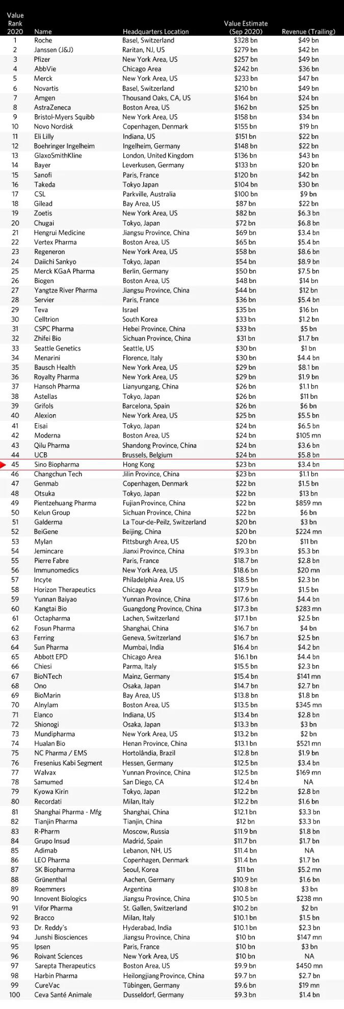 2020年9月,Torreya公布了《全球1000強藥企報告》,該報告按市值對1000家藥企進行了排名,中國生物制藥有限公司在該榜單中排名第45位,這1000公司年度總收入超過1.2萬億美元。